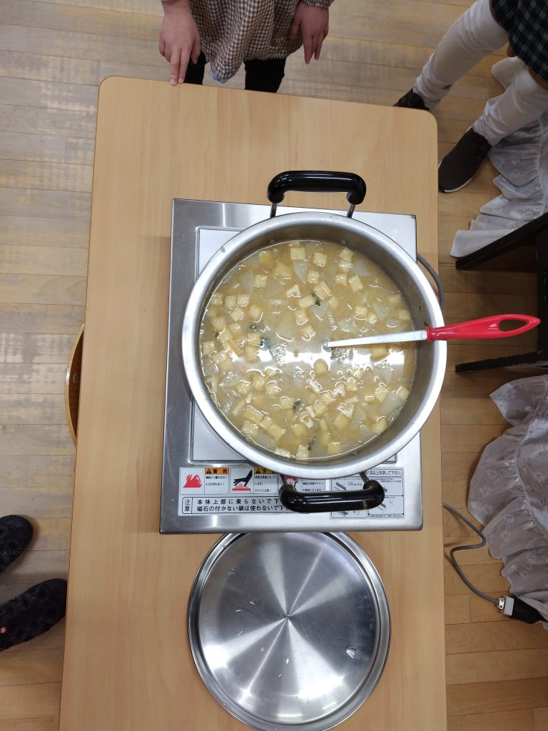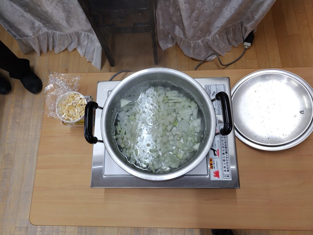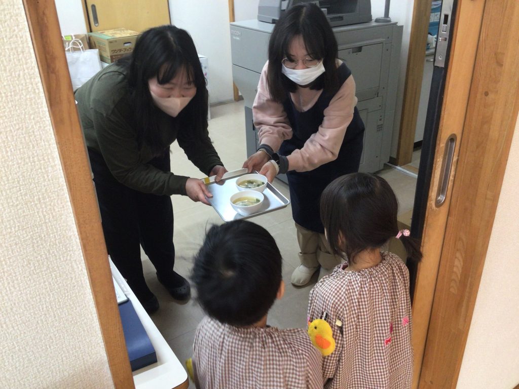 凧あげを終え帰園したら、机の上にお椀が。“かぶ”をつかったコンソメスープ。年少組の子どもたちが、みんなで“かぶ”を切って調理しました。子どもたちがプランターで育てた“かぶ”、世界で一番美味しいコンソメスープです。