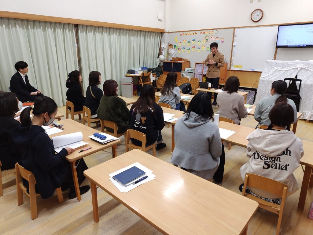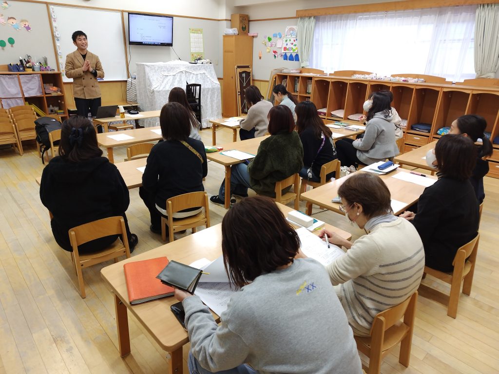 講師を招き、「子どもの人権」について教員研修を行いました。「子どもの人権」を実際の保育の中でどうとらえればよいのか、保育教育の実践をもとに具体的に子どもの人権について学びました。