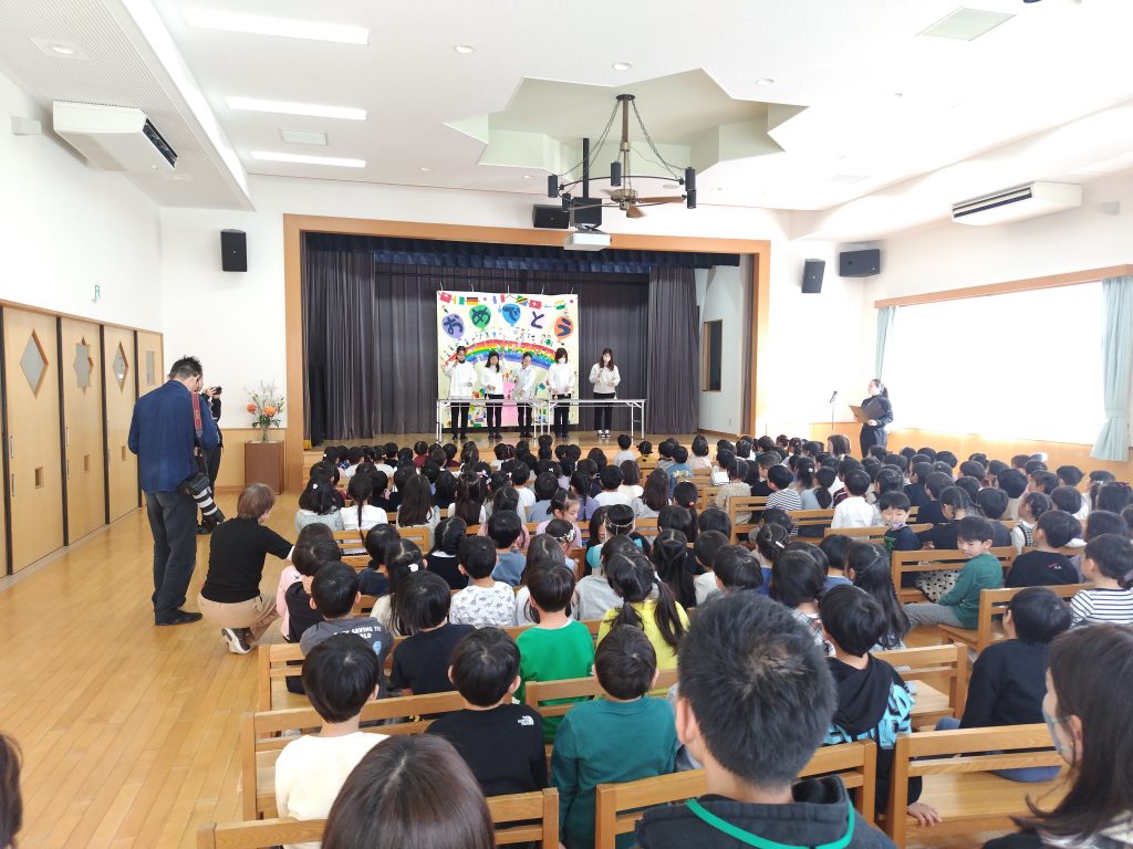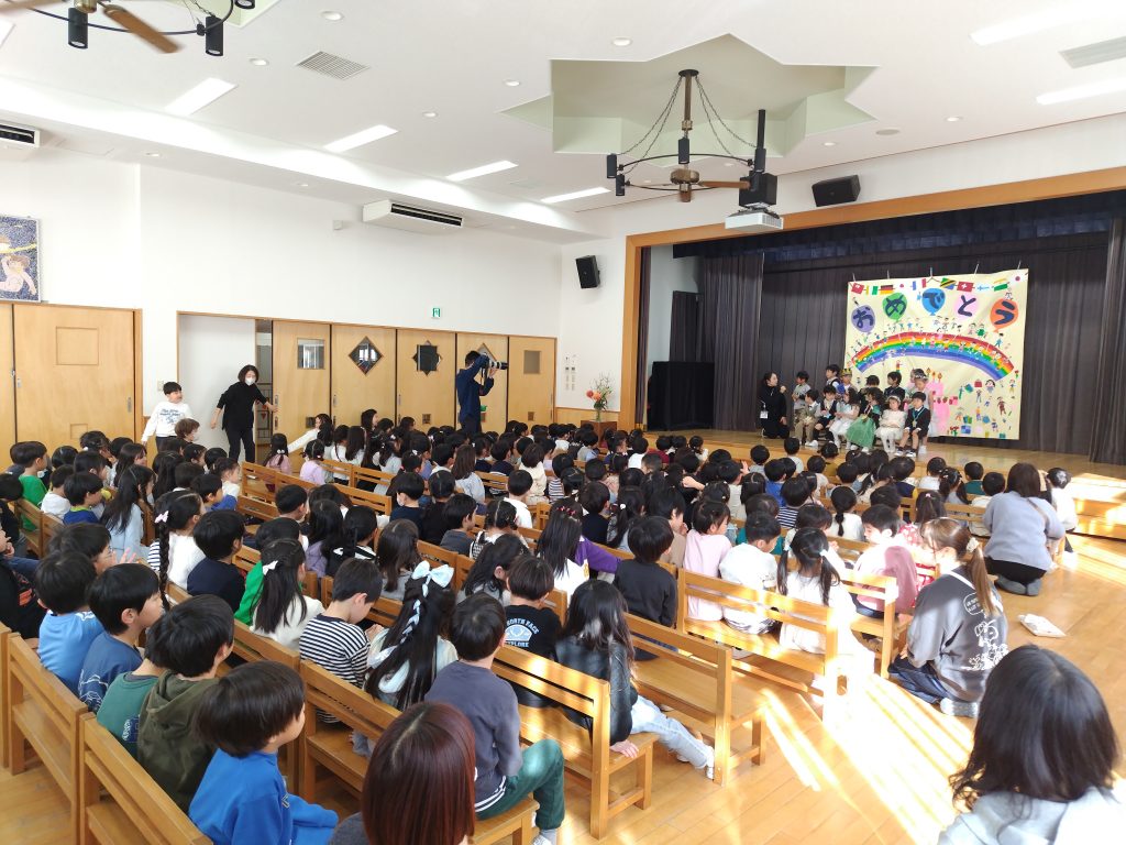 各学年から歌のプレゼント。子どもたちの元気な歌声が会場いっぱいに広がります。誕生会の締めくくりは先生方のステージ。ハンドベルの演奏がありました。子どもたちは、ハンドベルの美しい音色に耳を傾け、息を凝らしてステージを見つめます。忘れられない記念日になったことでしょう。