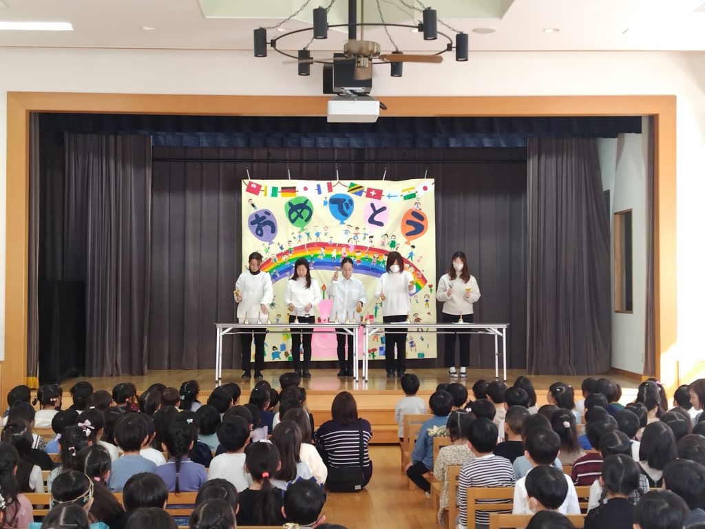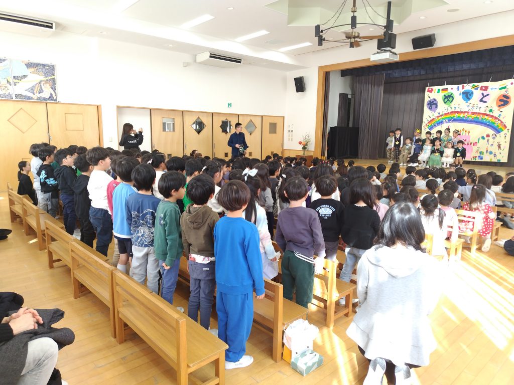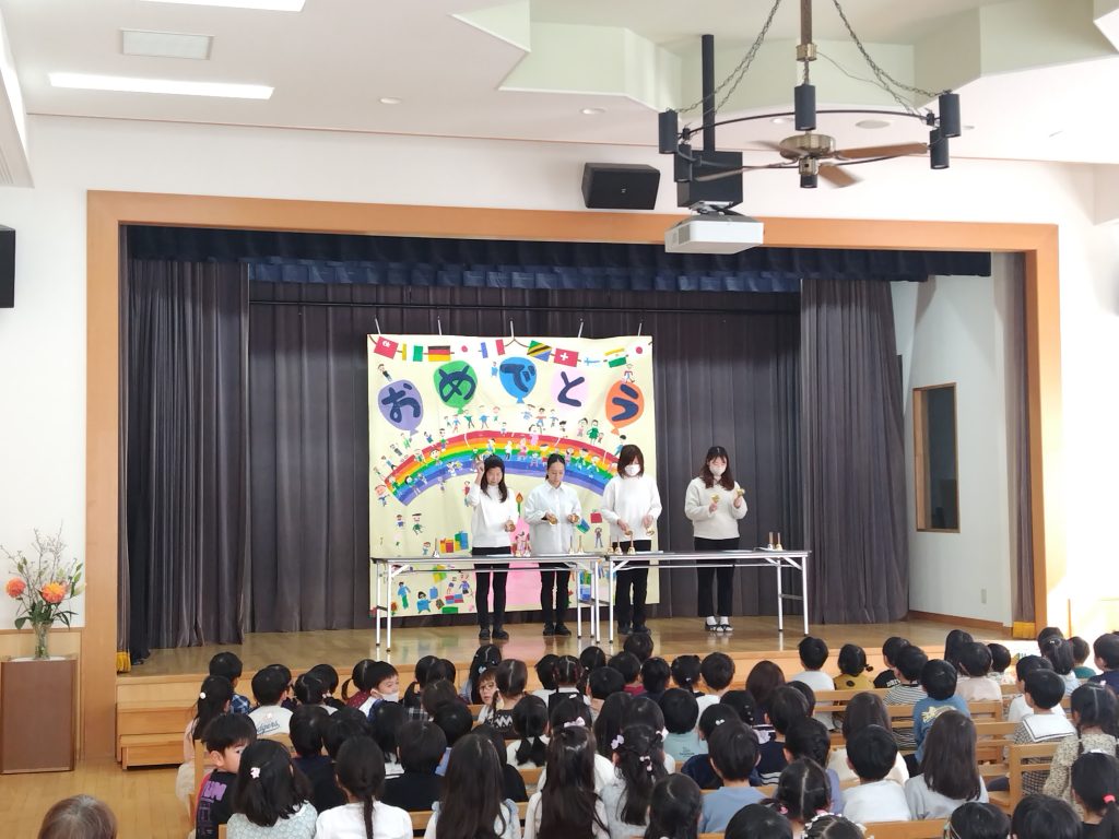 1月生まれのお友達の誕生日をみんなでお祝いしました。12月に欠席をしたお友達が一緒です。3学年が集う“お祝い”の時間。誕生児が名前を呼ばれ、胸にペンダントを下げてステージの上に。子どもたちが輝く瞬間です。インタビューが始まりました。年少組は名前、年中組はクラスと名前を言います。年長組は夢を語ります。