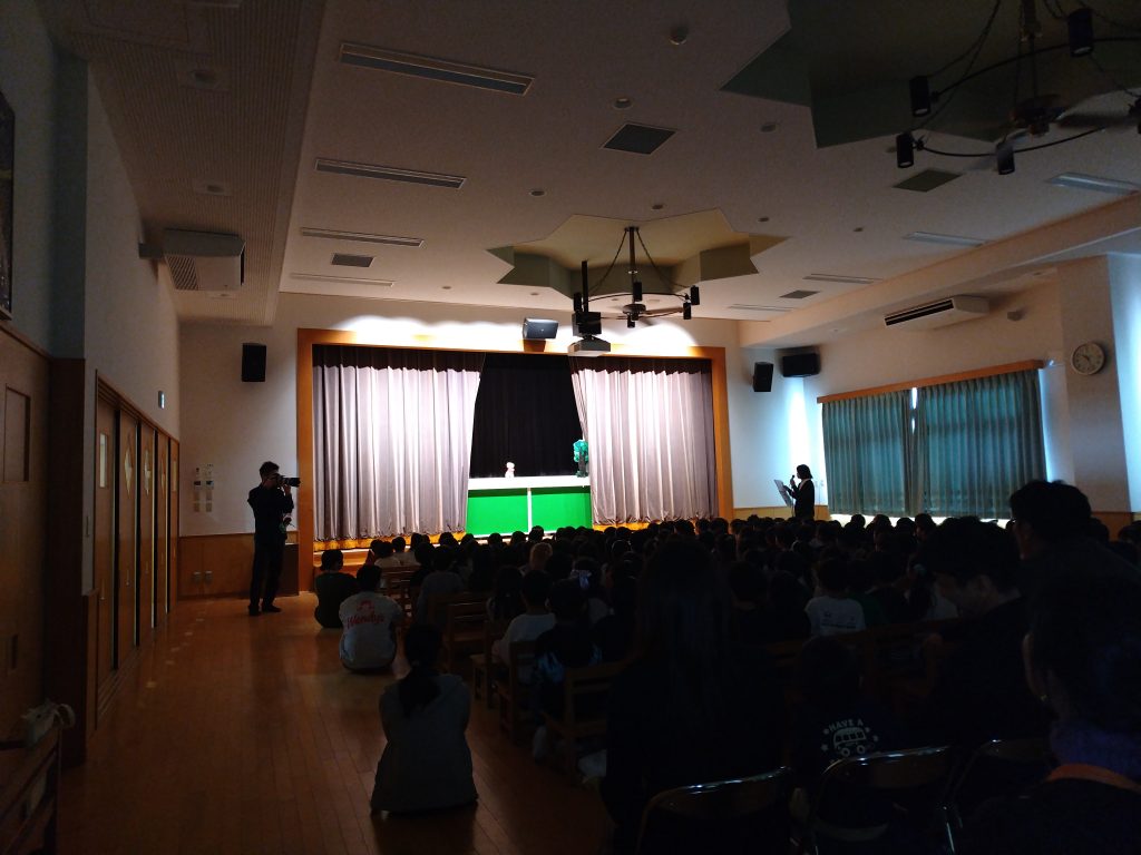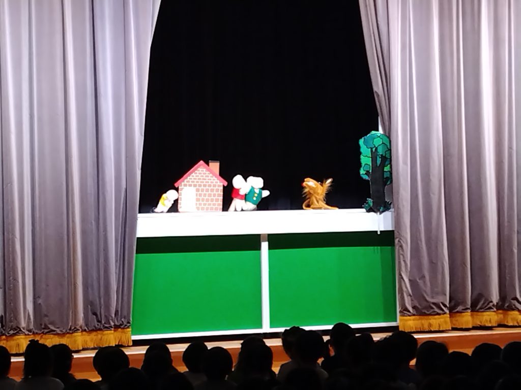 子どもたちのお楽しみは、先生たちの出し物。今日は『人形劇 三匹の子ブタ』。オオカミが出てくると、「あっちいけ、あっちいけ」と子ブタを応援し、オオカミが煮だった鍋に落ちると、「きゃぁっきゃぁっきゃぁ」とオオカミ退治に加勢していました。