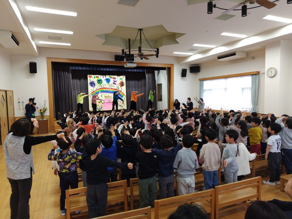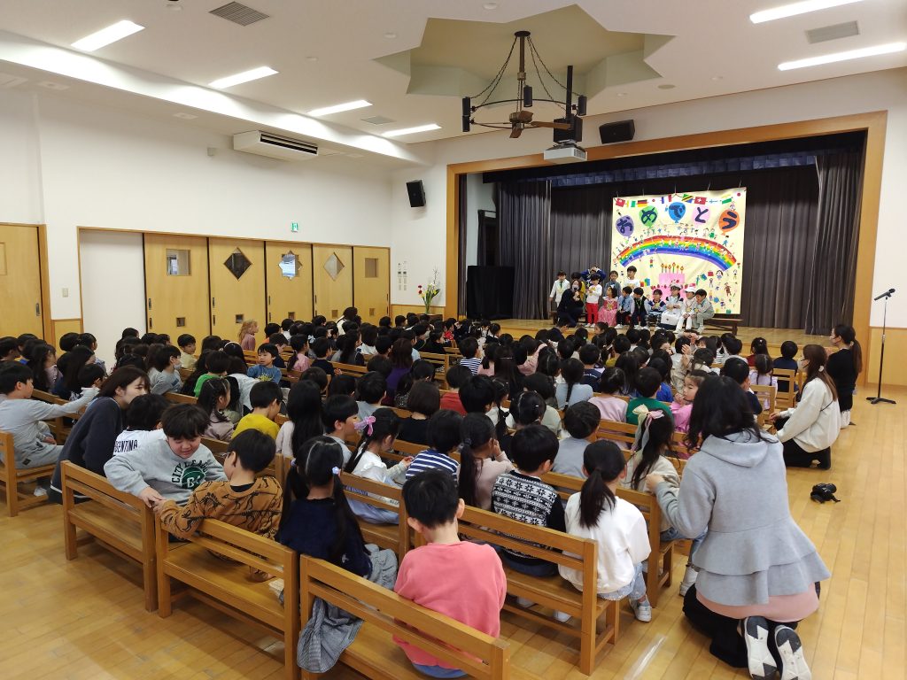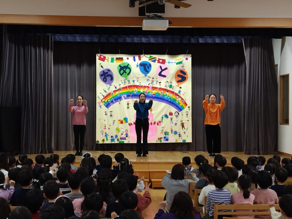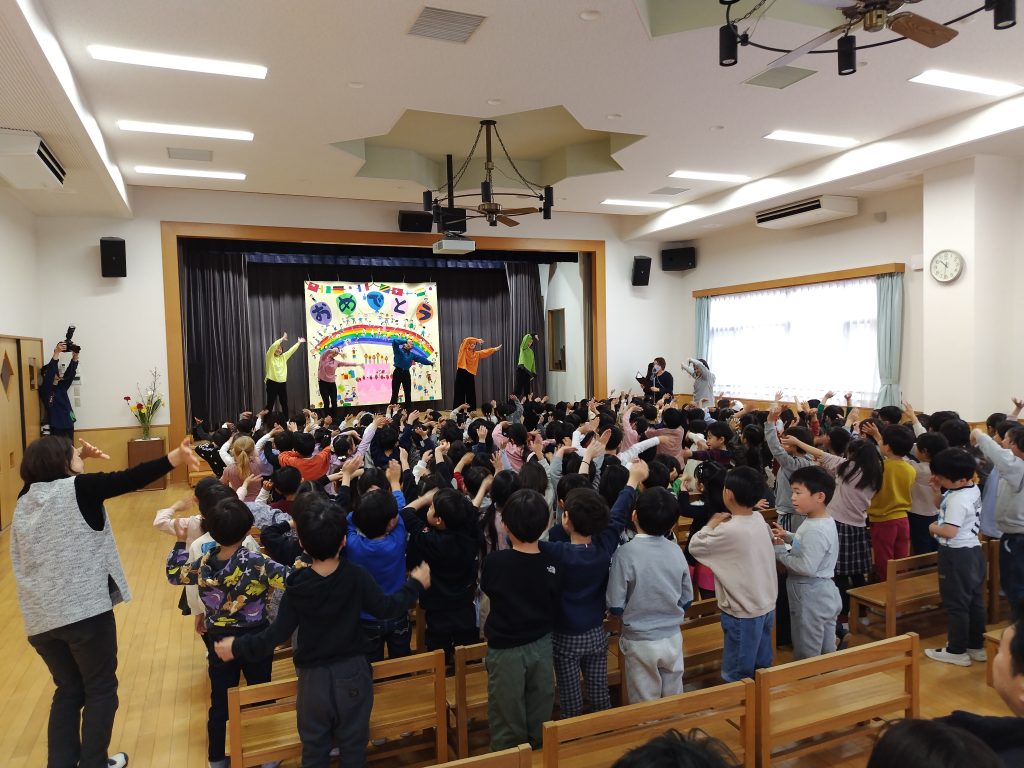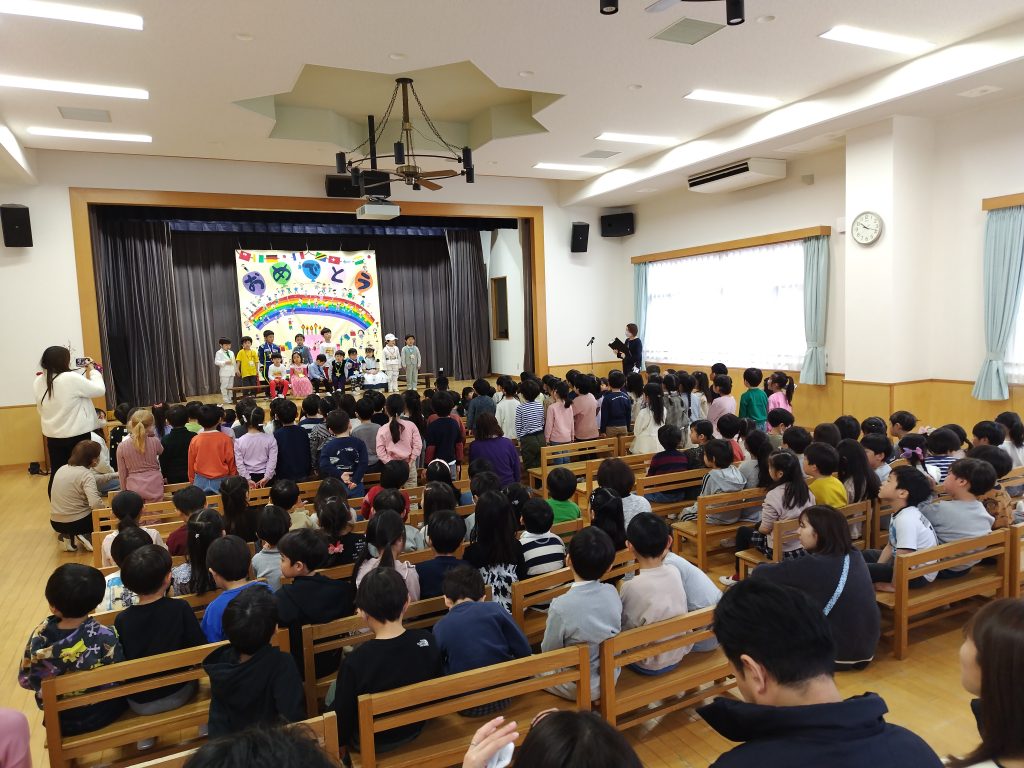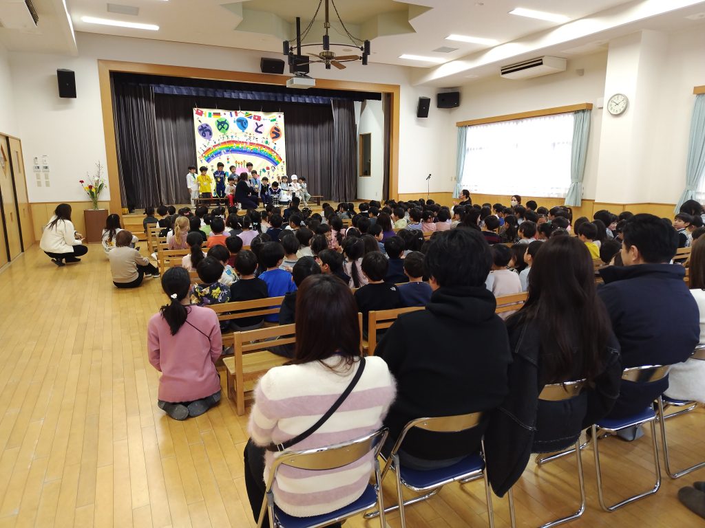お誕生会では、3月生まれのお友だちに、みんなで「おめでとう」とお祝いの言葉を伝えました。ステージの上から「ありがとうございます」と、お礼の言葉が聞こえてきました。心のこもった言葉のやり取り。