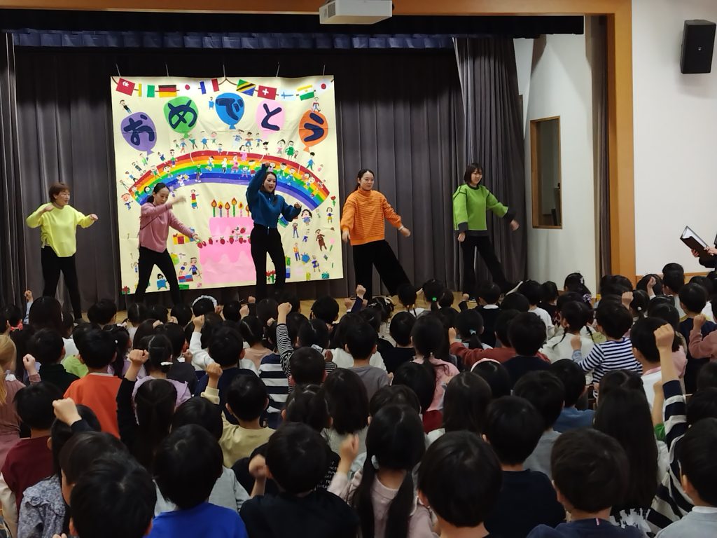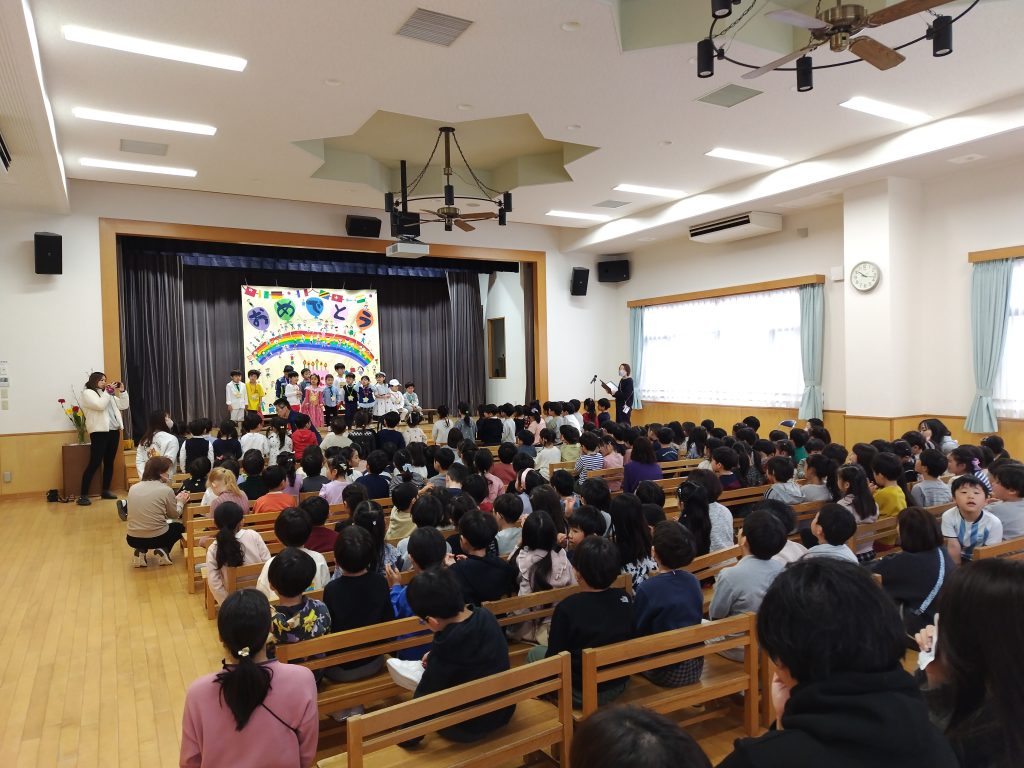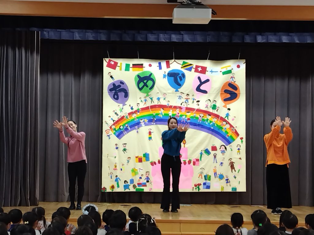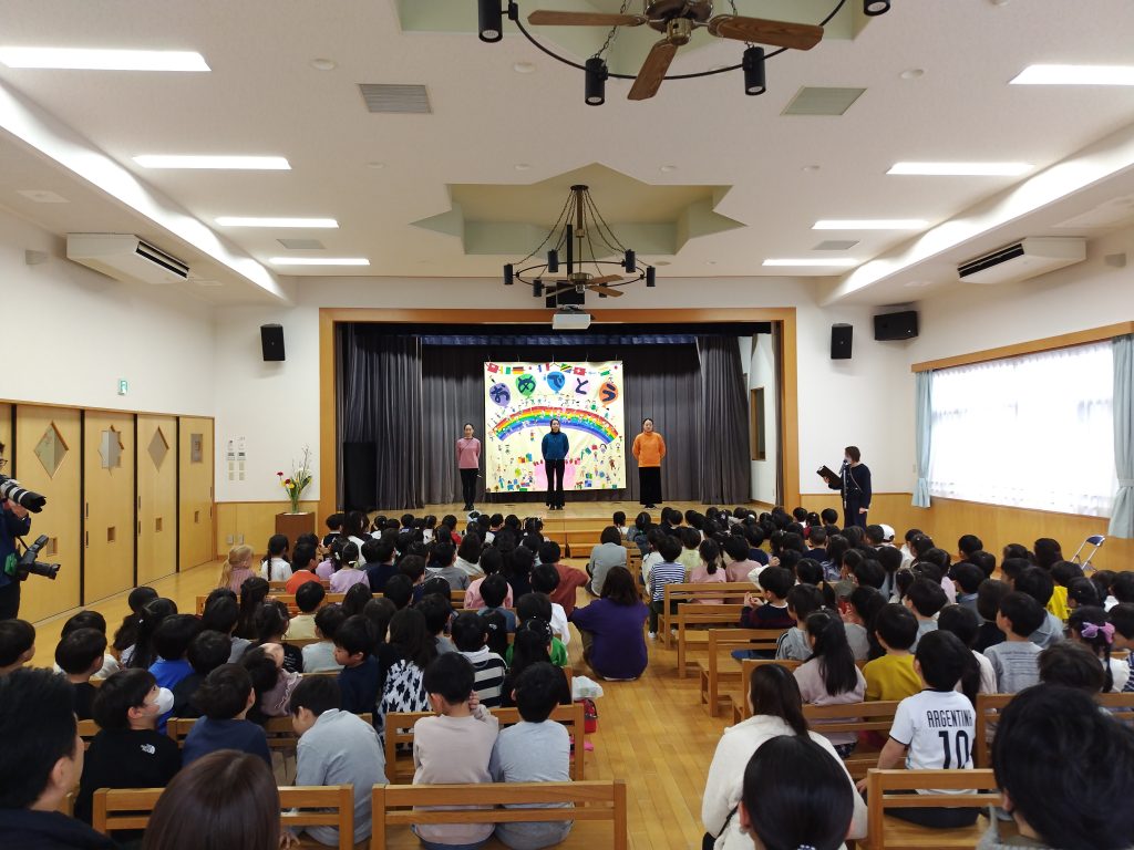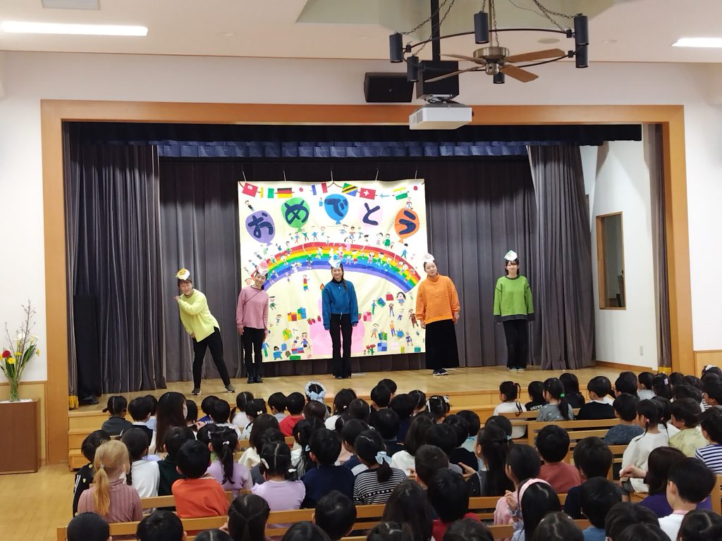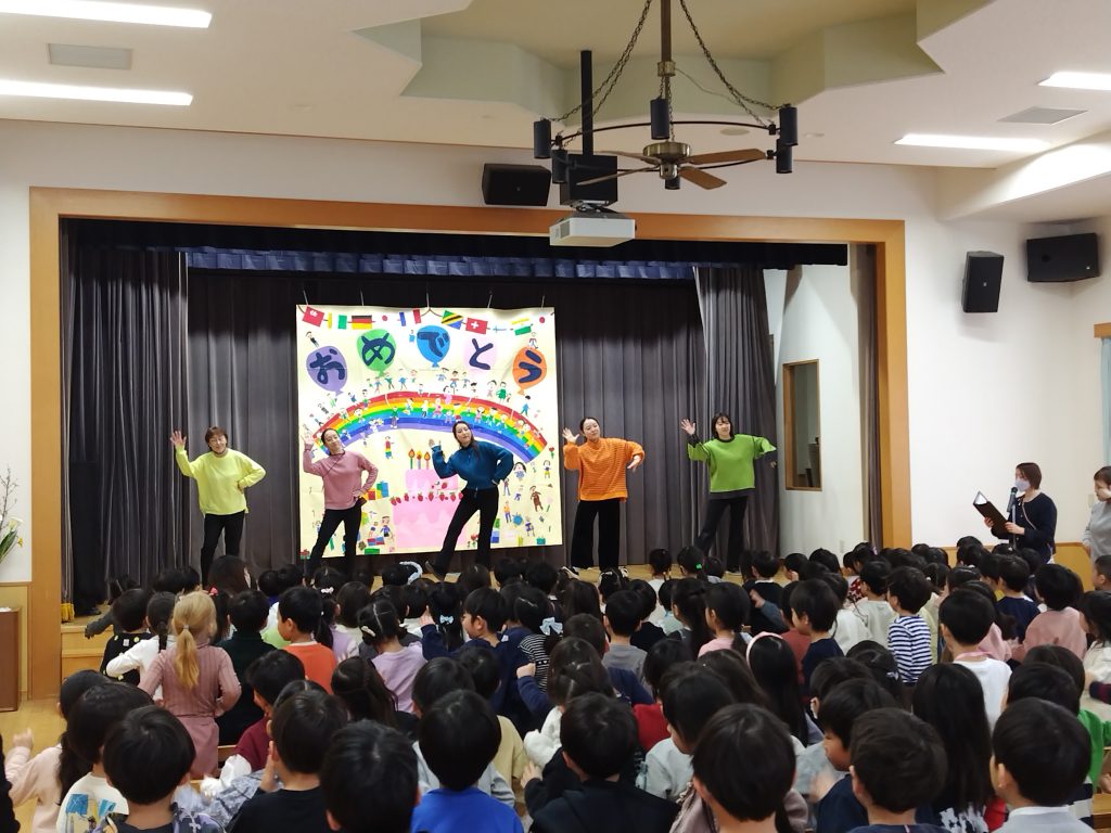 お誕生会では、3月生まれのお友だちに、みんなで「おめでとう」とお祝いの言葉を伝えました。ステージの上から「ありがとうございます」と、お礼の言葉が聞こえてきました。心のこもった言葉のやり取り。