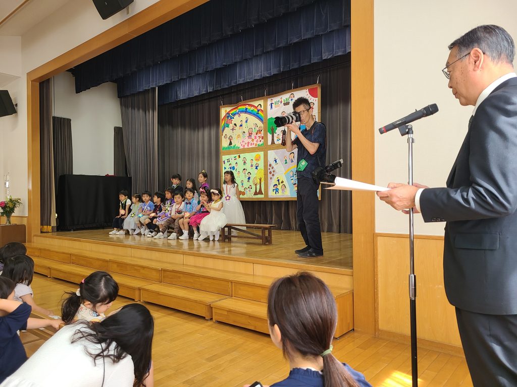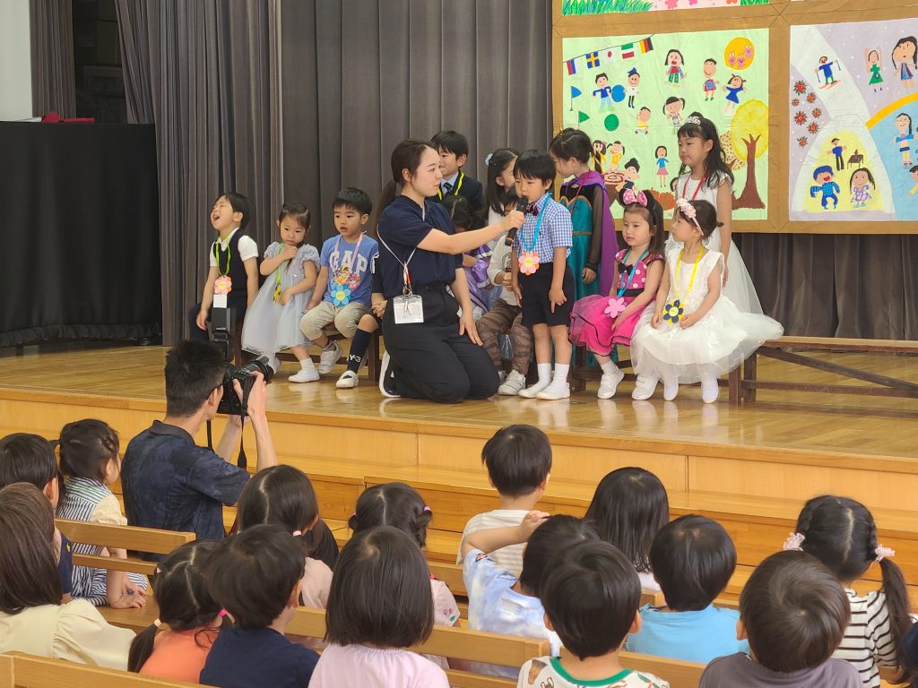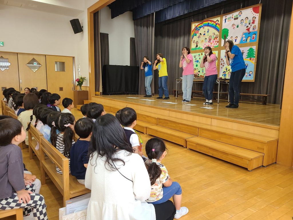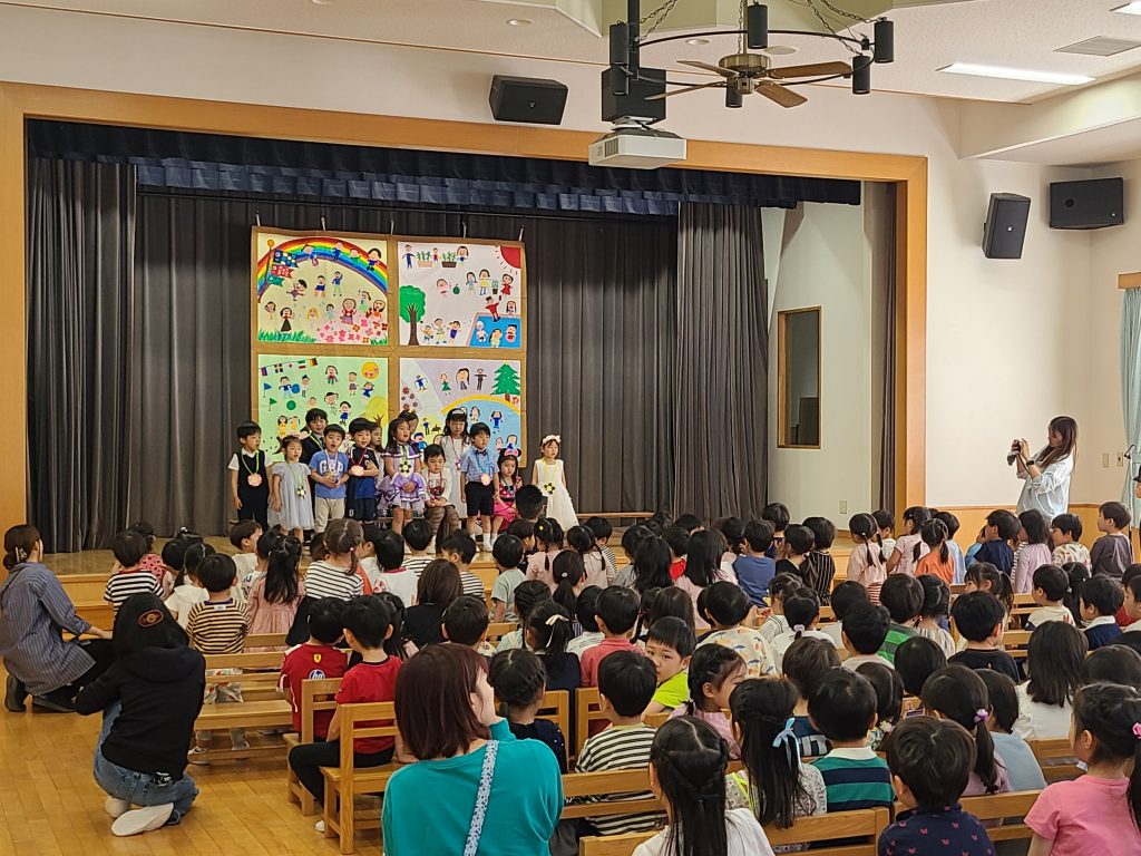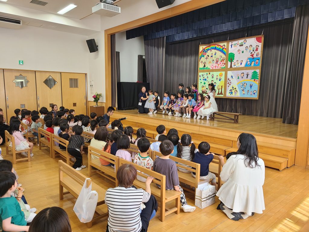 『誕生会』に初めて参加する年少組の子ども達は、落ち着いて静かに話を聞き、誕生児に関心をもっている眼差しがありました。ステージ上にあがる特別感に、はにかむ4月生まれの子ども達。登園時から周囲に「おめでとう!」と声を掛けられて嬉しそうにしている様子が印象的でした。