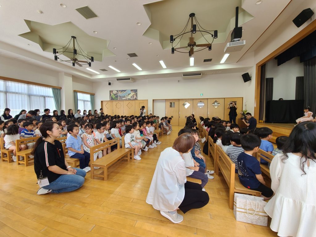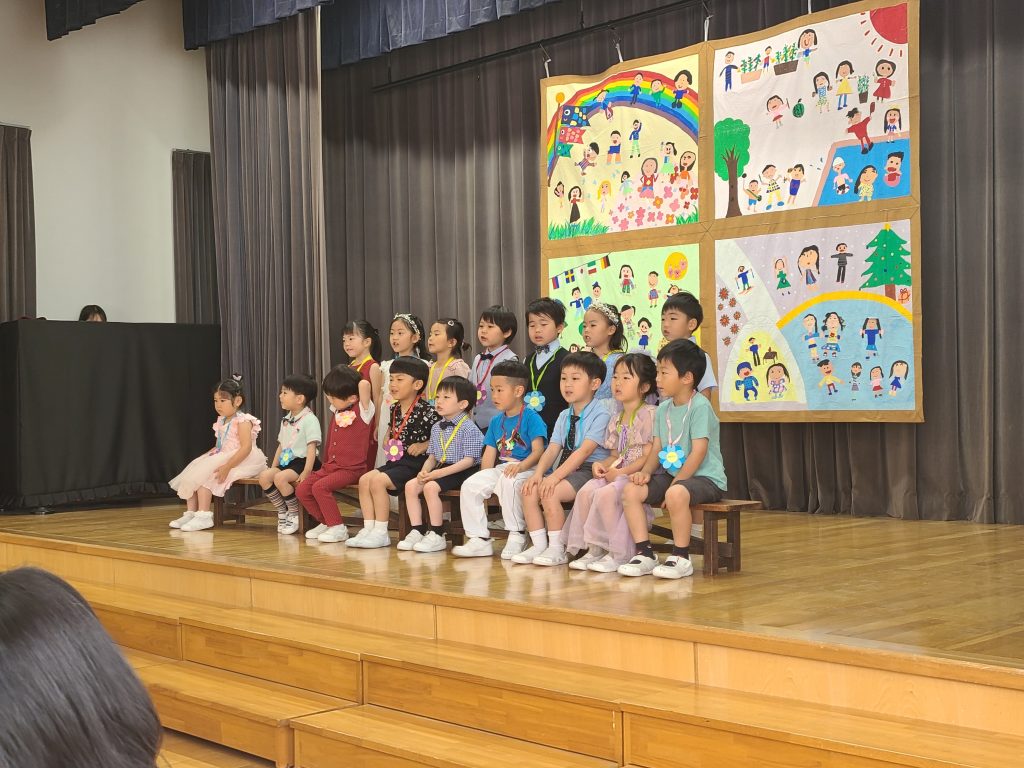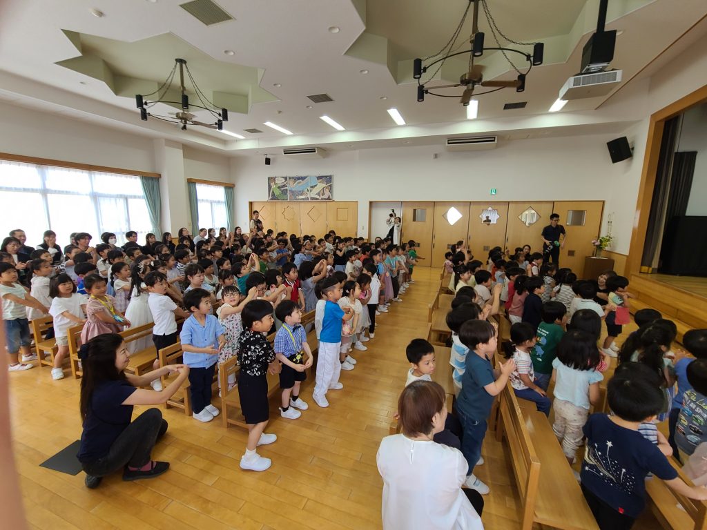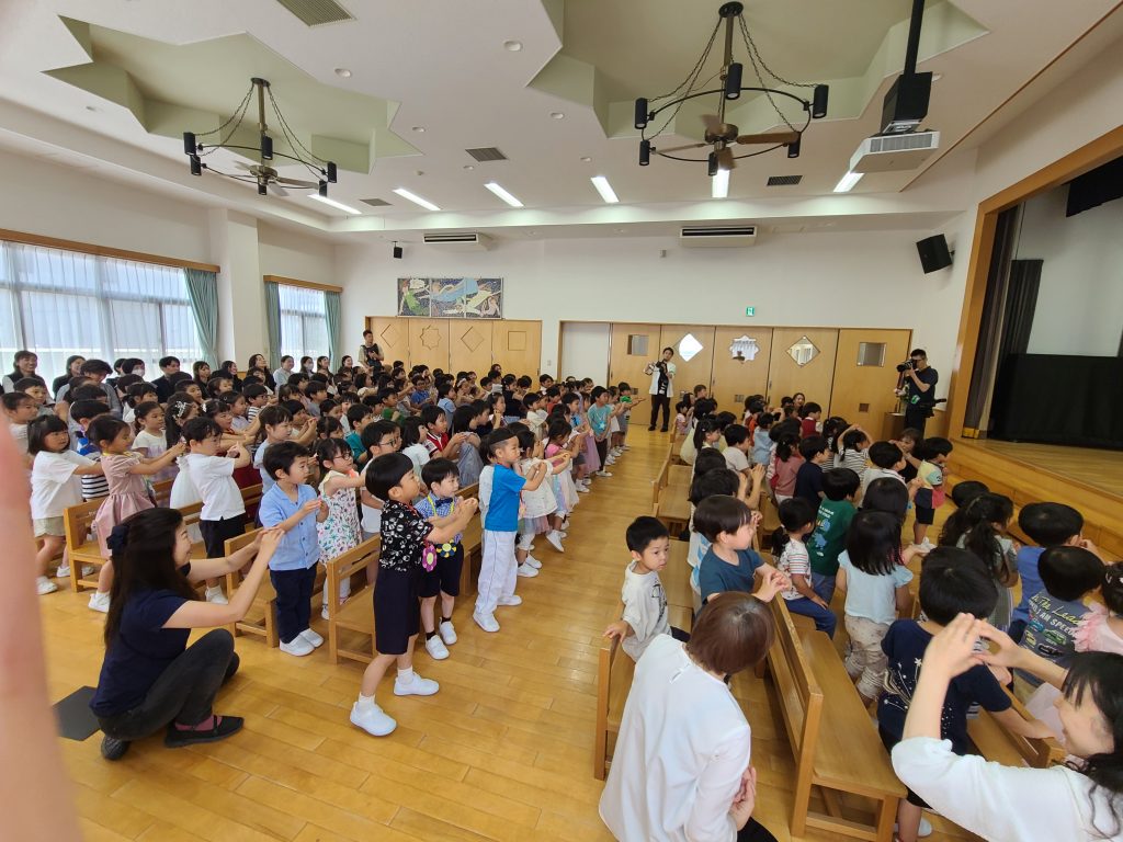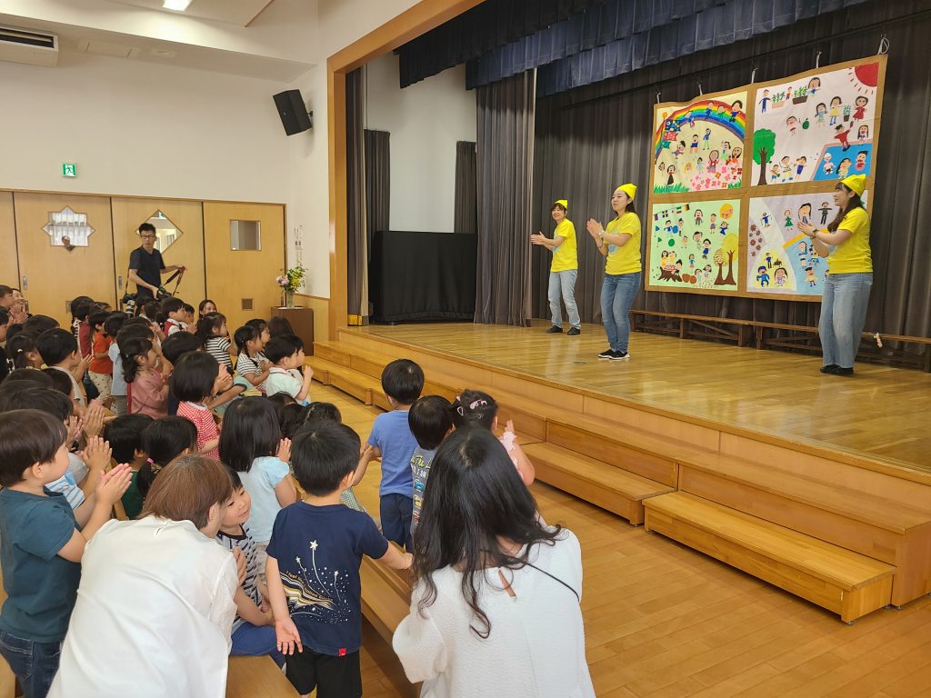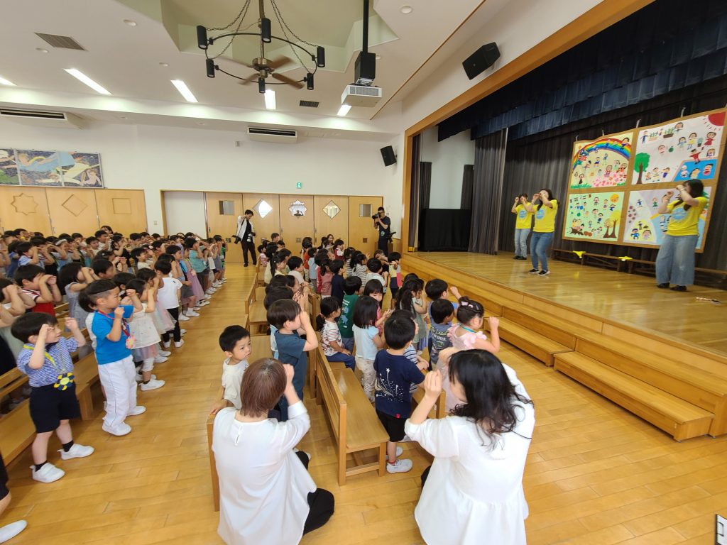 最後の先生達からのお楽しみでは、全員でダンスを踊り盛り上がりました。子ども達と混じりながら、今年度から就任された松木園長と森下事務長も恥ずかしそうにしつつも共に踊ってくださり、遊戯室中が楽しいひと時に包まれました。