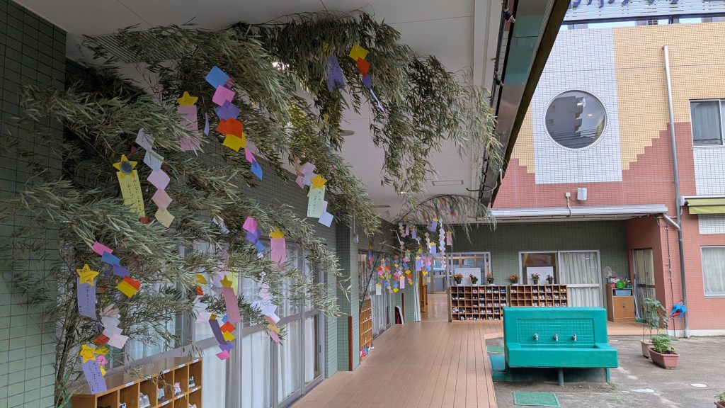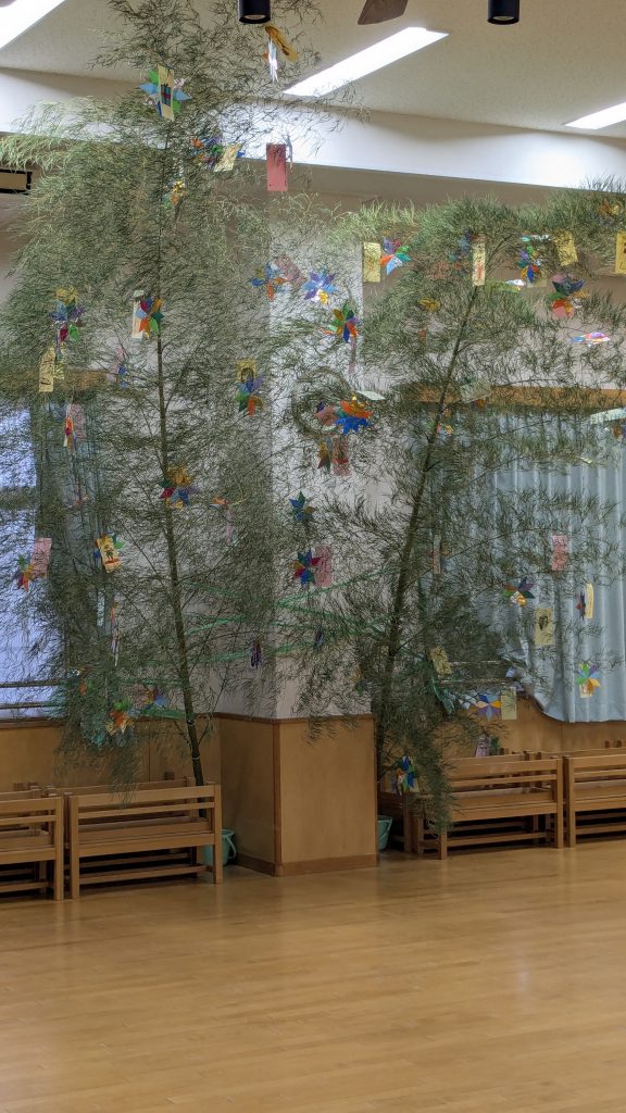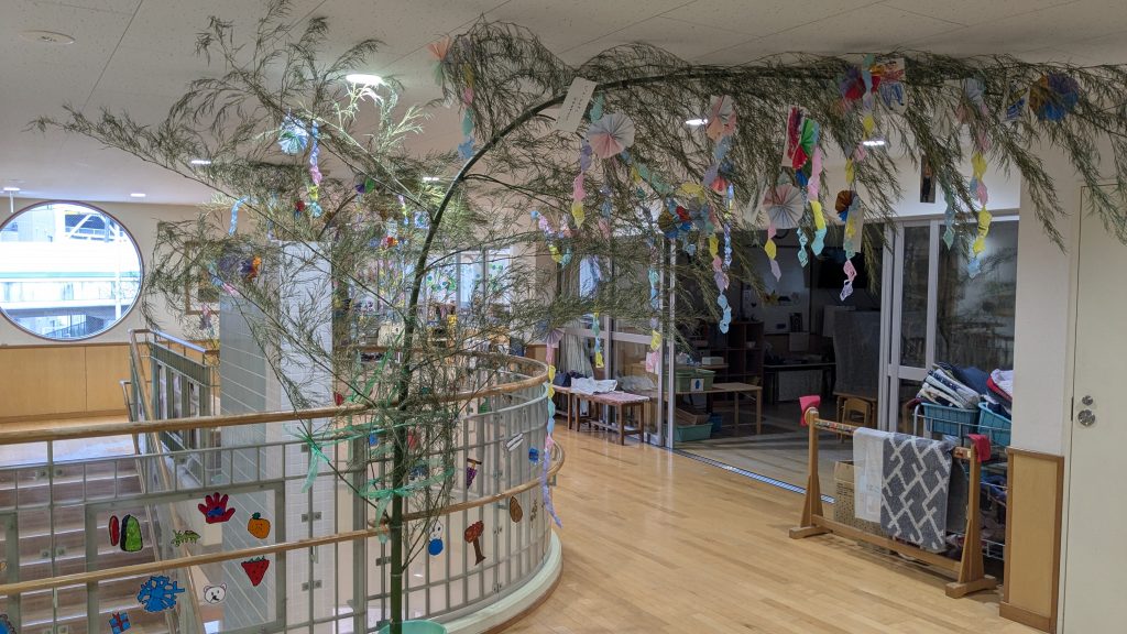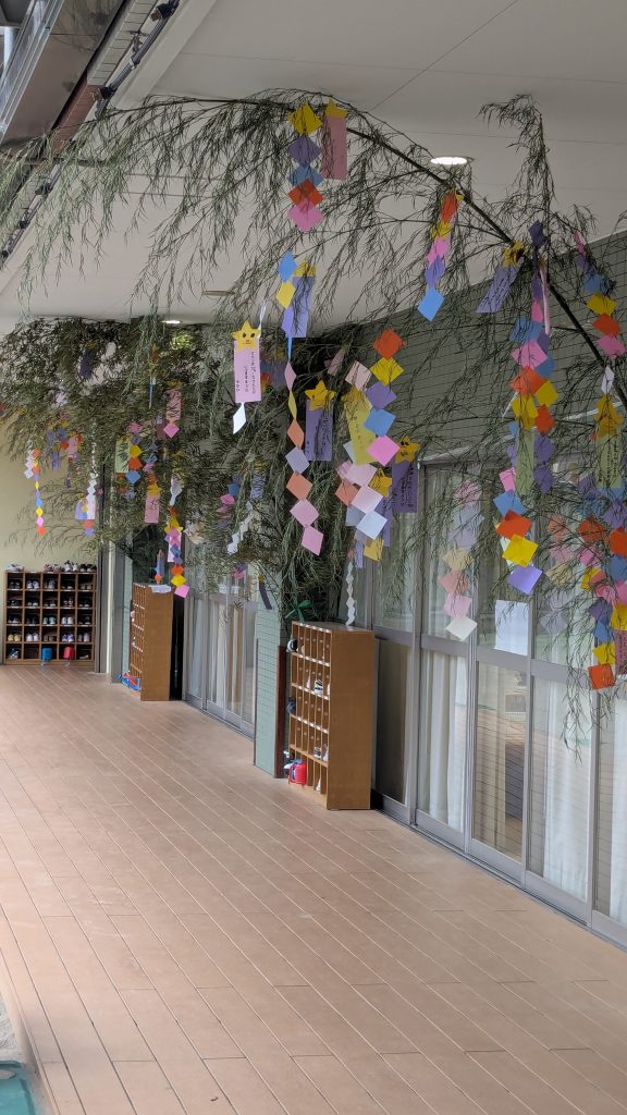 6月24日 七夕に向け笹飾りが揃いました 2025 6/27 2025.06.24 2025.06.27 昨日は園に大量の笹が搬入されました。人の背丈の倍以上の大きく育った素晴らしい笹です。先生方はそれぞれの学年に分けて、各フロアーに笹を立ててくれました。子どもたちの思い思いの願いが書かれた短冊も沢山つるされました。みんなの願いが叶うように、天の川からも良く見える立派な笹飾りになりました。七夕までもう少し、お星さまが見えるいい天気になるといいね。 6月20日 ペイントデイ(年中、年少) 6月27日 水遊び(年少)