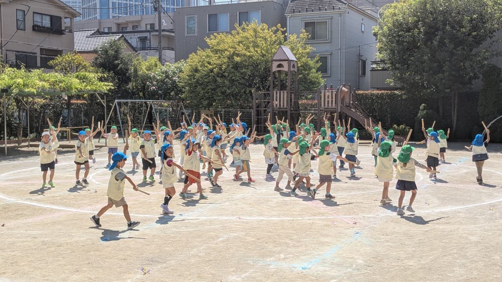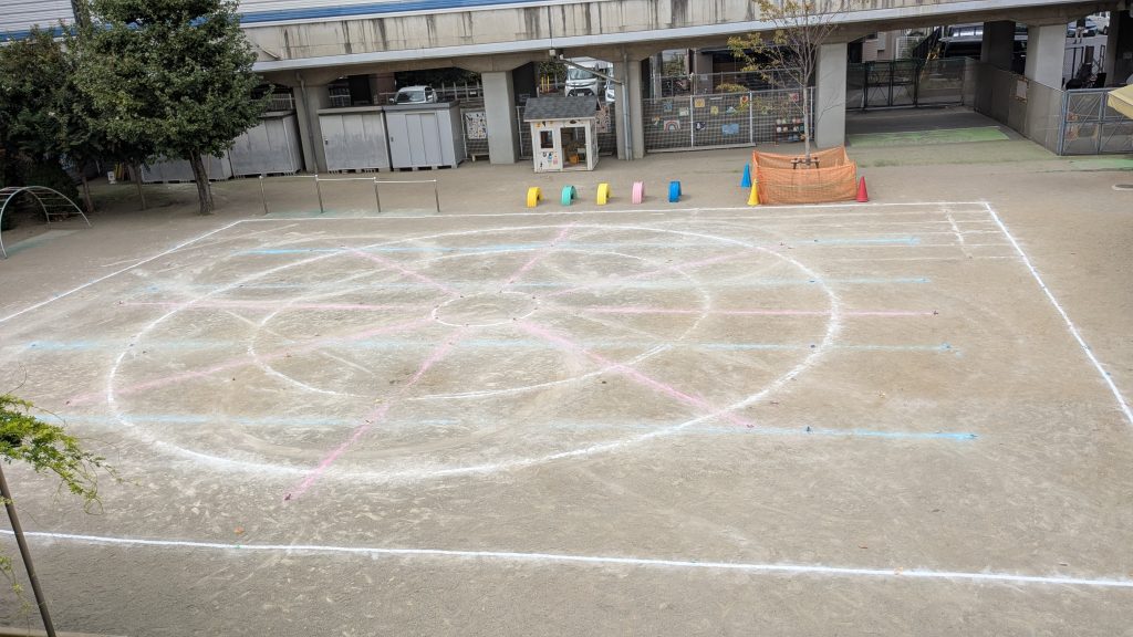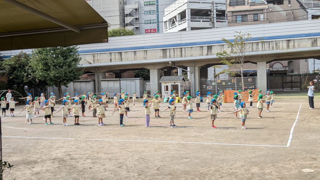 秋晴れが続く中、10月11日(日)の運動会に向けて先生方の指導にも熱がこもってきました。園児たちも先生方の熱意が伝わり、それぞれの演目に向けて全身で頑張っています。全員で行う「はとぽっぽ体操」から始まり、かっけこや障害物競走、そして、それぞれの学年によるマスゲーム練習に園児たちはとても集中し、お友だちと協力し合い取り組んでいます。園児たちの真剣な眼差しと元気な歓声に大きな成長を感じています。園庭には沢山のラインが引かれ、園児たちのフォーメイション作りを支援しています。